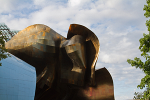 The sky was starting to clear, so we hung around to photograph the Monorail entering and exiting the EMP Museum. The architecture
