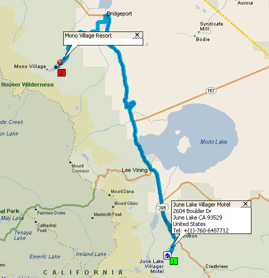 So far, we've tried hard to force a square peg into a round hole. Conditions are simply not good for the photography we planned. It was time for a change. We decided to play tourist and drive up to Twin Lakes near Bridgeport. Neither Carol nor I had ever been there, and this was a good time to check it out. We drove along Upper Twin Lake until we reached the end of the road and the entrance to Annette's Mono Village. The gate was locked so we didn't venture in, but it looked like a very nice resort. It's right on the lake with peaks towering 3000 feet above it. The pictures on the Websites of the two resorts on Twin Lakes indicate there are a lot of serious fisherman up here in the summer.