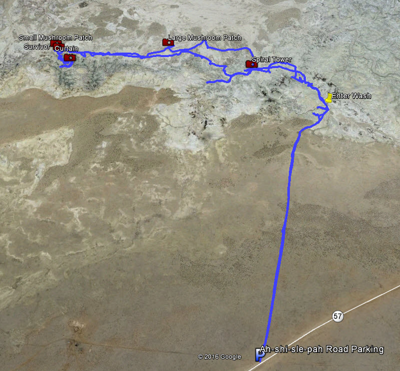 Today, we checked out a new badlands area called Ah-shi-sle-pah. It not only had no trails, it also had no signage on the highway. And I use the term "highway" with reservations since Highway 57 was just another dirt road. It also had no developed parking lot. A double track left the highway and people park on a small grassy knoll that has been packed down by usage. If I didn't have the coordinates from Google Earth, we would have NEVER found Ah-shi-sle-pah.
