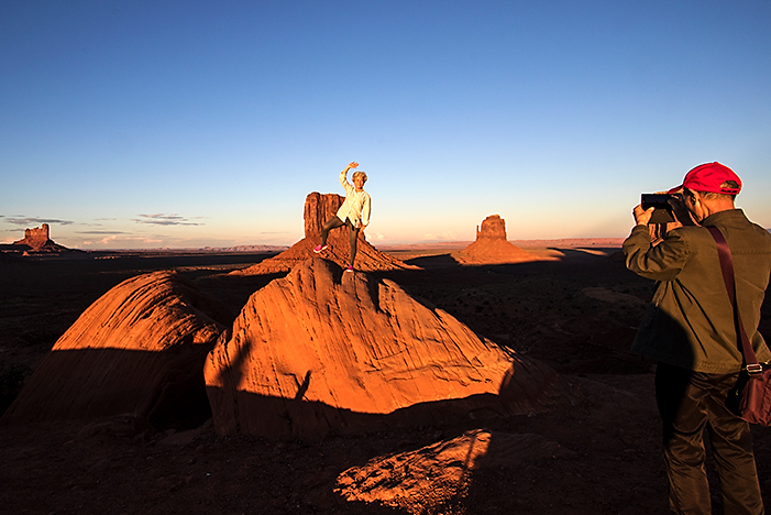 by standing on one foot and posing. Then she would re-balance and do another pose. It finally dawned on me that I should be photographing her. I missed the best part of her "show," but I managed to photograph her husband photographing her. At this point, it was cute. But then it was her turn to photograph her husband. He would stand off to the side of the scene with a very tough-guy look. Now, this guy is probably 85, not even 5 feet tall, and couldn't have weighed more than 120 pounds. But he had the tough-guy look down pat. Then, he would turn a few degrees and have his wife take another photograph. This went on for about ten minutes. By the time they were done, the sun was nearly at the horizon and the good light was gone.