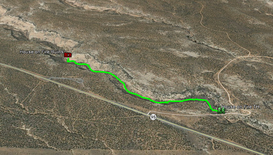 House on Fire Ruins gets its name from the late-morning light that reflects off the canyon walls and into the alcove that holds the ruins. The light reflects off the uneven surface of the cracking roof, and it looks like the roof is on fire. The floor of the alcove is a dark reddish color, and the reflected light paints the ruins and alcove roof a warm gold. Outside the window when the light reflects perfectly from the canyon walls, the ruins are a drab gray.