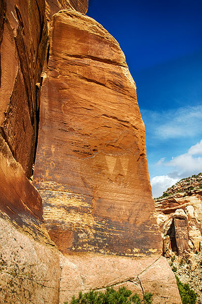 Our first stop was Newspaper Rock. It included some of the best petroglyphs we've seen. The petroglyphs were etched into the rock over a period of about 2,000 years by people from the Archaic, Basketmaker, Fremont, and Pueblo cultures. More recently, contributions from Ute and Navajo people, as well as Western Europeans were added to Newspaper Rock. Two of our favorite sections show a hunter on a horse facing off with a gigantic bison and another hunter on a horse shooting an arrow at a deer.
