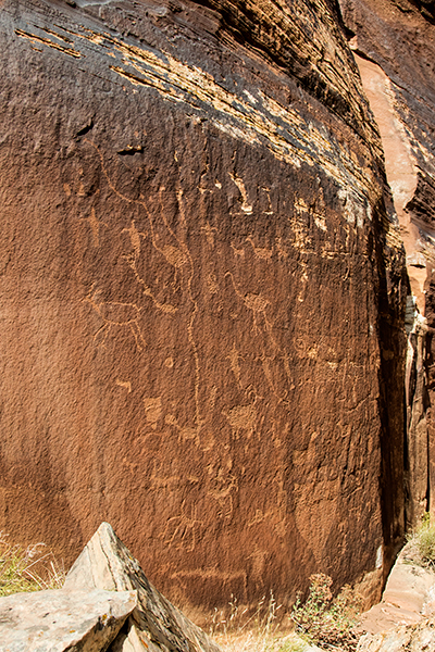 The petroglyph panels of Shay Canyon were our second destination. The panels were scattered along a cliff face above the wash. We climbed up to a ledge that followed the contours of the canyon walls and provided access to the petroglyphs. We timed it nearly perfectly. As we hiked up the canyon, the panels facing west were lit. When we returned, the east-facing panels were lit.