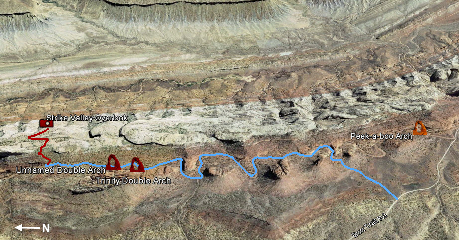 On the hike back to the Explorer, we photographed the two northern arches high on the canyon walls. From the middle of the wash, they weren't that impressive. But when we hiked to the base of the canyon wall, we could look through the arches and discovered they were both double arches. Trinity Double Arch was especially impressive.