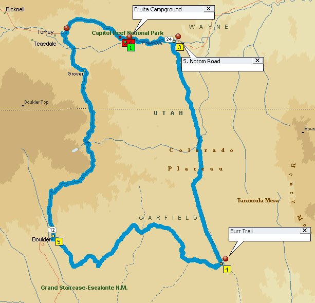 Today, we drove the Burr Trail loop from Capitol Reef to the Notom-Bullfrog Road, up the switchbacks of the Burr Trail, across a plateau, through colorful Long Canyon, past the petrified sand dunes near Boulder, over Boulder Mountain, and back to Capitol Reef. This is always an amazing drive because you parallel the Waterpocket Fold for the first 20 miles and then climb up over the fold where it looks like no road could possibly be built. John Burr built the original trail to move his cattle from the plateaus in the fall to the lower pastures east of the fold. In the spring, he reversed the cattle drive. How he found or built the original trail is beyond me.