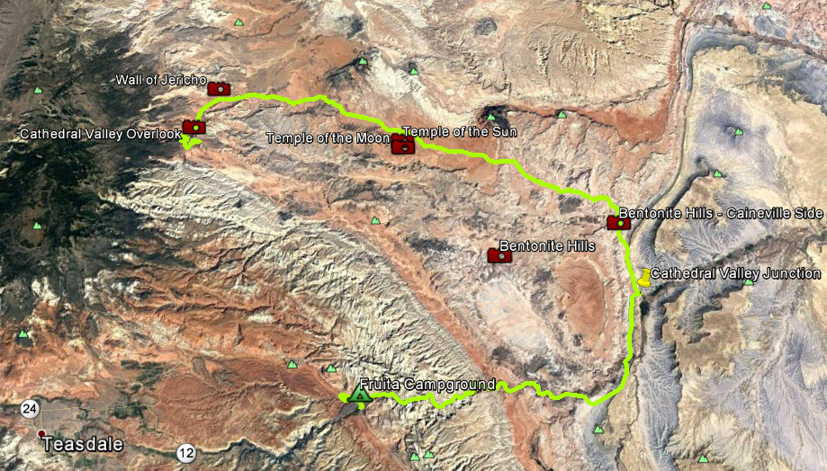 The weather is cooling a little each day. We woke up this morning to clear, blue skies again, but the temperature in the motorhome was a chilly 45. We turned on the furnace to at least get us to 50 degrees. We finished making lunches, ran our generator for a few minutes, and then drove to Cathedral Valley. Today, we were going to drive all the way to the west end of the valley, climb to the top of the plateau, and walk out to Cathedral Valley Overlook.