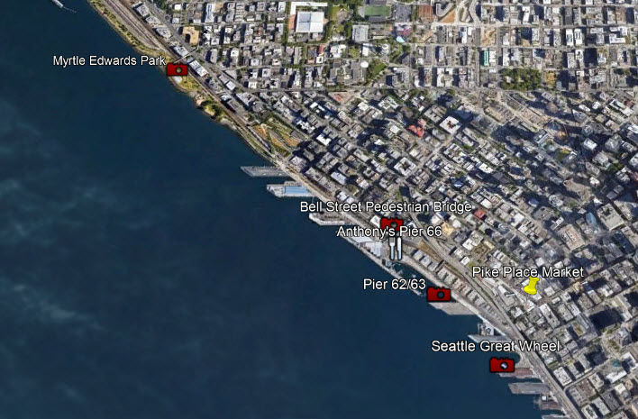 After lunch and another nap, we eventually drove down to the waterfront for sunset. We found a parking place to explore Myrtle Edwards Park and then wound our way south to the piers. The Mariners played the Blue Jays in an afternoon game, so we saw people wearing Blue Jay jerseys all up and down the boardwalk. It was another beautiful evening, so the waterfront was crowded. We walked all the way south past the Great Wheel as we looked for things to photograph. Then, as the lighting improved, we started back north; stopping at the best shooting locations we had identified earlier. Our favorite locagtion was on the top of the building overlooking Anthony's Pier 66 Restaurant. It provided a view of the Great Wheel with a small marina in the foreground. The Bell Street Bridge also provided a good view, but it was getting pretty dark by the time we shot there. We hiked the mile back to the Explorer and tried to find our way back home in the dark. I don't know what we would have done without our trusty GPS.