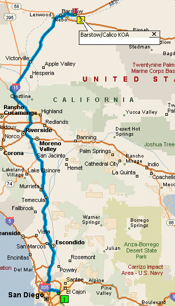 Today was mostly chaos. We normally get all our preparations done several days in advance of a trip and then just relax the last couple of days before we leave. This trip didn't work out that way. It all started when we took our motorhome home in for it's pre-trip maintenance appointment. Everything went well, and they called to tell us we could come and pick up the motorhome. Just as we were ready to back out of the garage, the phone rang. One of the technicians had sheared off our rear-view mirror when he moved a dump truck. Ordering the part from Alabama, installing the new part, and then taking the motorhome to another shop to get our front end aligned meant that we lost an entire week of preparations. That took us from "every thing's cool and we're ready to go" to chaos and "How are we going to get everything done?" And just to make sure to make today more interesting, I had an appointment in the morning to meet my new doctor. That meant we didn't leave until after 3:00 and we hit traffic in Escondido, which delayed us so we hit traffic in Temecula and then more traffic in San Bernadino. Instead of arriving at 5:30 long before dark, we arrived at the Barstow/Calico KOA in pitch black. The KOA is in the middle of the desert with almost nothing around it and down a long, narrow, frontage road. The woman at the campground was very gracious and made sure we got to our campsite without hitting anything, but it was a very long day!