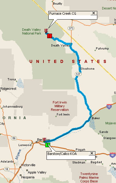 We went back to bed, made a leisurely breakfast, and left camp at 11:00. We had a wonderfully uneventful drive to Death Valley. High clouds covered the area with the sun peaking through periodically. But even with the clouds, it was 94 degrees.