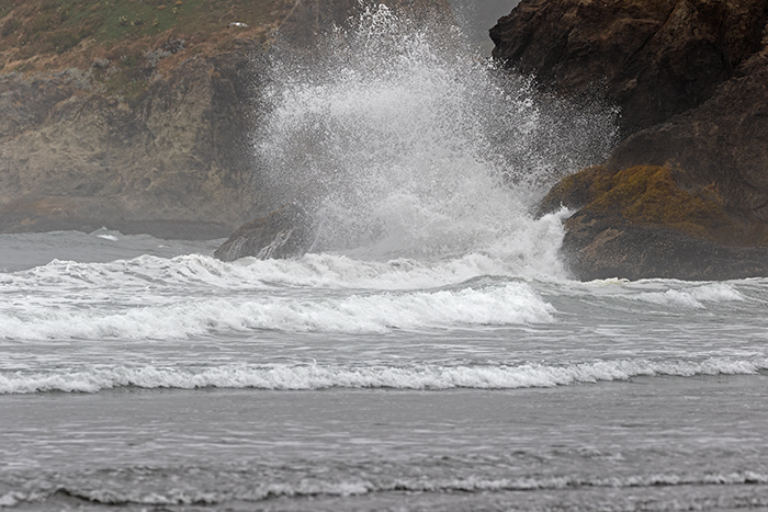 Then I noticed what looked like white water coming out of one of the formations. Water coming out of a huge rock piqued my interest, so I grabbed my camera gear and hiked down to the beach. Mostly hidden among the sea stacks was a window in a turret-shaped rock that waves poured through when the largest waves hit. This little collection of sea stacks created an intimate cove with just the right mixture of water and sand to create almost perfect reflections. Over the course of an hour, I noticed the waves growing as they crashed on the rocks below "the turret." It was an ebb tide, but a large storm off-shore must have been generating the growing waves. Eventually, the waves grew large enough to warrant walking all the way back to the Explorer to get my long lens.